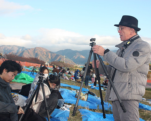 えびす講煙火大会の撮影も30年近く続けている、花火写真の第一人者・金武武(かねたけたけし)先生。美専生への撮影レクチャーの3年目。1年目は土砂降り。2年目は暖かった。さて今年は?