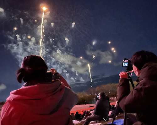 先立つ「映像表現」授業に先生をお招きしてから、2週間ほど経ち本番に望んだが、なんと今年は雲のない絶好の撮影日和に。学生はデジタル一眼レフカメラで思い思いに迫力の花火に挑み、傑作を追いかけた。
