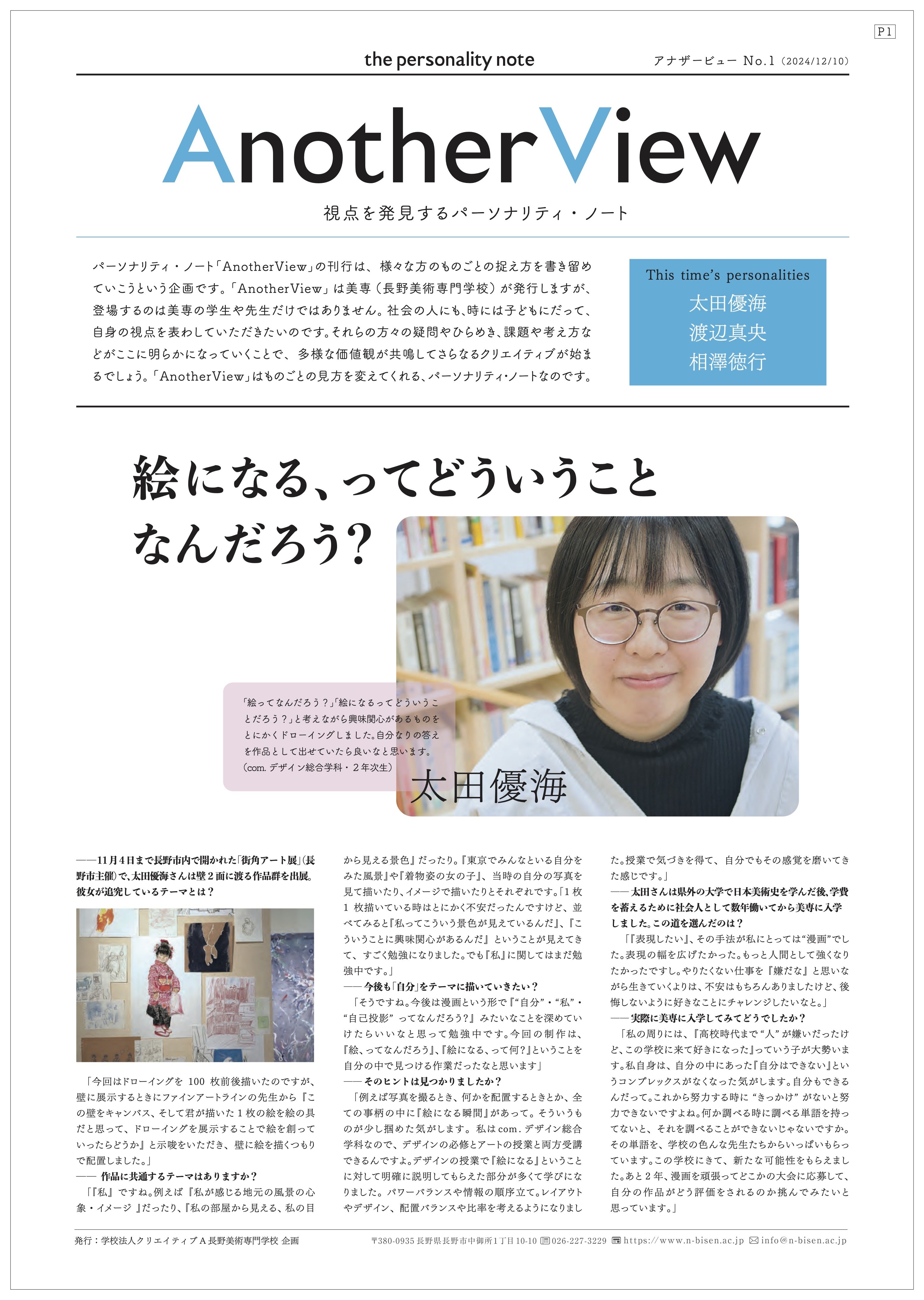 「Another View」創刊しました 2025.01.07 この度、視点を発見するパーソナリティ・ノート「Another View」を創刊しました。 ぜひご一読ください。 https://n-bisen.heteml.net/bisen/press/another_view01.pdf ツイートする シェアする LINEで送る